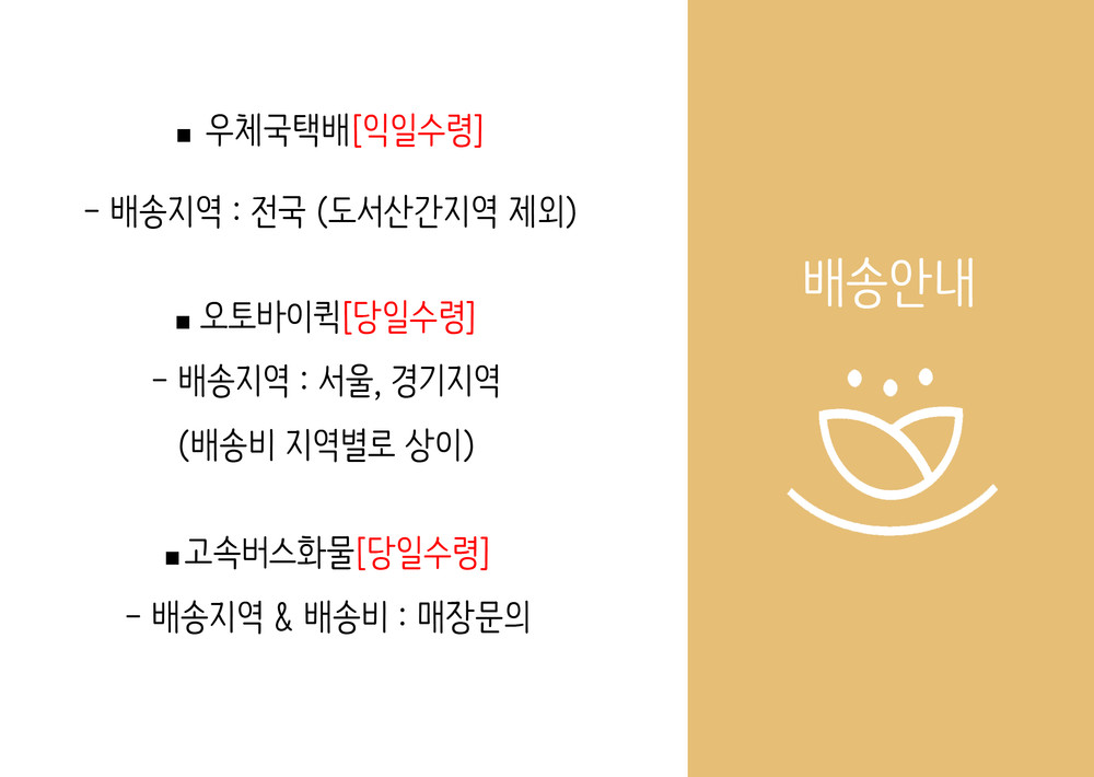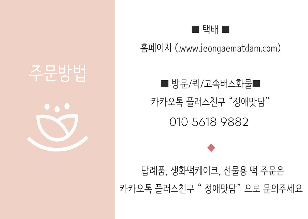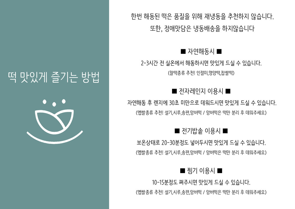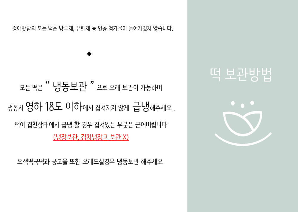 제품 수령 후 당일 드실것을 제외한 나머지떡은 동봉된 보관방법대로 보관해주세요