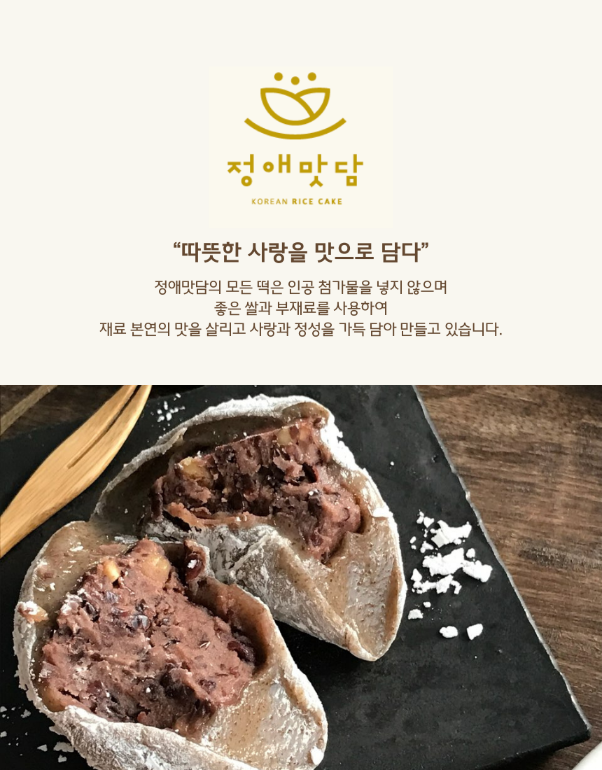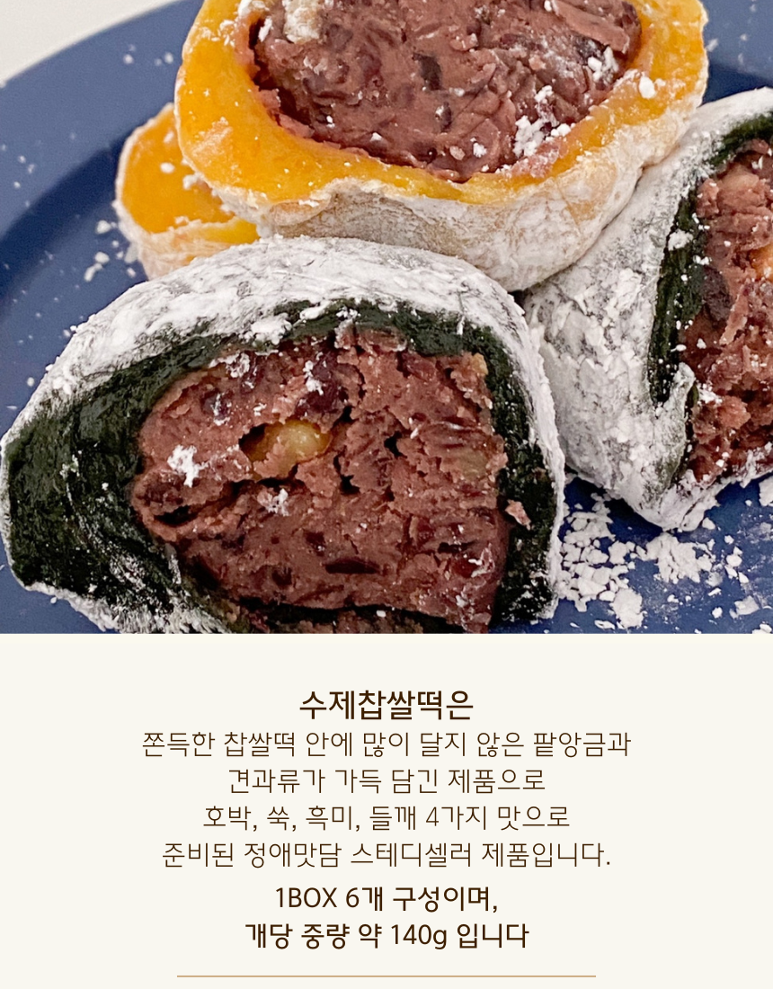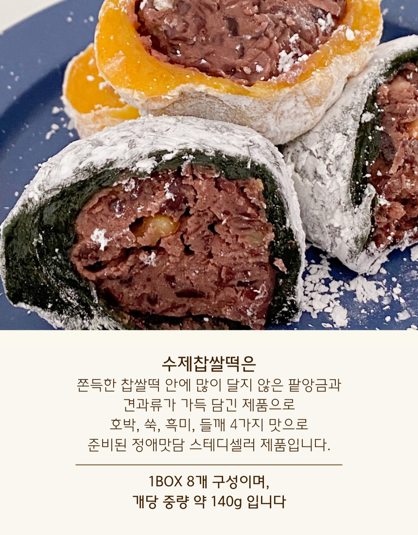 견과류가 믹스된 앙금으로 가득 찬 수제 찹쌀떡입니다