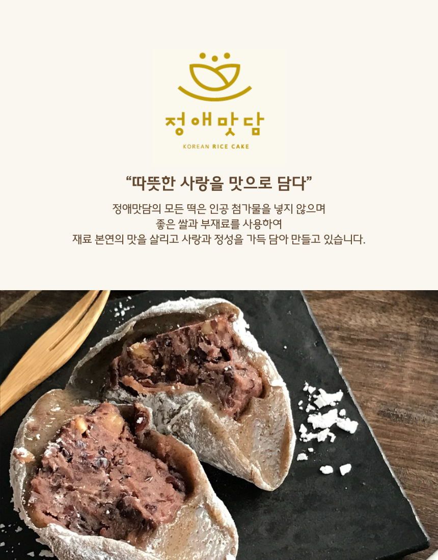 쫀득한 찹쌀떡안에 가득찬 팥앙금과 견과류가 들어간 정애맛담 수제찹쌀떡입니다